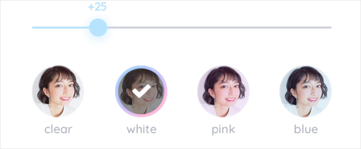 写真の印象を大きく左右するフィルターは、「クリア」「ホワイト」「ピンク」「ブルー」の4種類。自撮りで”盛れる”フィルターに厳選することで、フィルター選択ミスによる失敗を防ぎます。各フィルターの濃さは0~100の間からお好みで設定可能です。