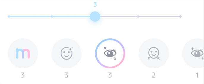 顔や髪の加工度合いを自分好みに調整できる「マイレタッチ」機能は、分かりやすさを重視したシンプルな設計。 全種類の加工度合いをまとめて設定できる「すべて」のほか、各メニュー(美肌、デカ目、小顔、目キラキラ、髪ツヤ)ごとに5段階から個別に選択することも可能です。