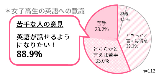 英語が苦手な女子高生のうち、88.9%が”英語をもっと話せるようになりたい”
