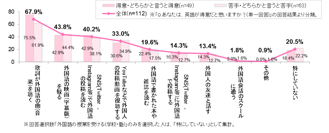 ・上位5項目のうち「外国語の映画(字幕版)」、「SNS(Twitter,Instagram)で外国語の投稿を読む」、「YouTubeなどで外国人の投稿動画を視聴する」は、得意・苦手の各層いずれもほぼ同率