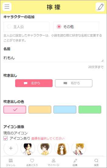 投稿画面では、作品のジャンルやキャラクター、シチュエーションのタグを選択。吹き出しの色や背景色も簡単な操作で設定でき、さらにセリフ・情景描写・心の声それぞれを、自分好みの内容にこだわって作成することが可能です。