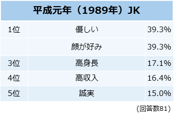 もし結婚をするなら、相手に望む条件は?(最大3つまで)【平成元年(1989年)JK】調査結果