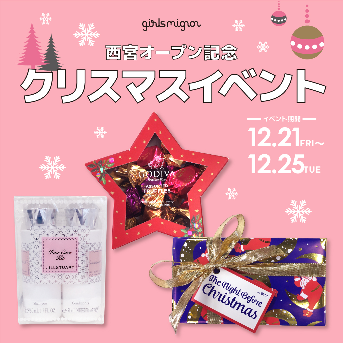 対象期間中に、『girls mignon』ACTA西宮店でプリを1回撮影した方に、抽選で豪華賞品をプレゼントするクリスマスキャンペーンです。