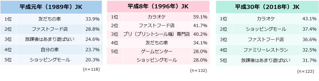 フリュー株式会社(本社:東京都渋谷区、代表取締役社長:三嶋隆 以下、フリュー)が運営する女子高生・女子大生の動向調査・研究機関『GIRLS’TREND(ガールズトレンド) 研究所』は、2018年11月に「平成の女子高生(JK)に関する世代別トレンド」の調査を実施しました(サンプル数:373)。本レターは、2019年4月30日で平成が終わりを迎えるにあたり、平成元年(1989年)、平成8年(1996年)、平成30年(2018年)の各世代における女子高生の流行を比較する連続企画です。2回目となる今回は、「遊び」に関連する調査結果を以下のとおり発表いたします。
