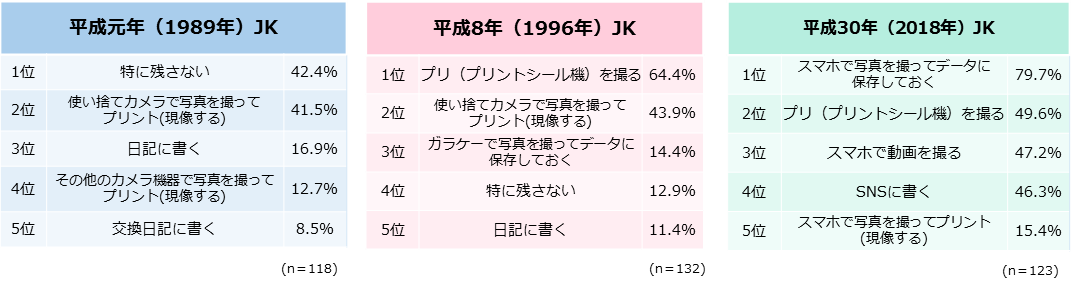 思い出の残し方1位は、使い捨てカメラ→プリ機→スマホ写真と変遷。プリ機は現在2位で人気継続