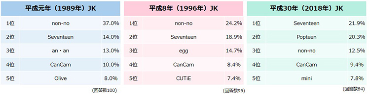 non-no、Seventeenがどの世代でも上位に。特徴的なのは、ギャル向けの雑誌として知られた「egg」が平成8年にランクインしている点。