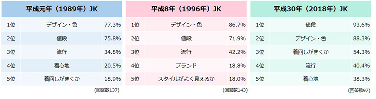 一方、平成30年は1位に値段が、3位には着回しがきくかがランクイン。流行よりもいかに安価で使いやすいかに注目している。