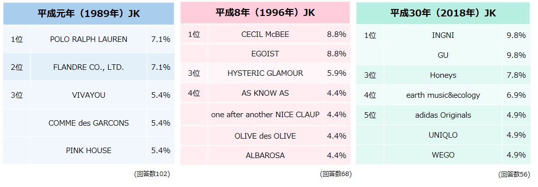 平成元年からは、ラフな “アメカジブランド”と、”DC(デザイナーズ&キャラクターズ)ブランド”と呼ばれる個性的なファッションカテゴリーの流行が伺える。平成8年はSHIBUYA109に出店するギャルブランド、平成30年はプチプラ、ファストファッションが多数に。