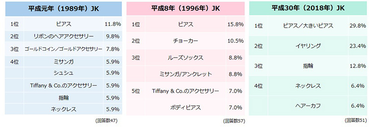 各世代、ピアスが第1位で、時代とともに割合が増加している。平成8年には、”アムラー”ファッションの一つとして知られたチョーカーが2位に。平成30年はイヤリングがピアスに続いてランクインし、ピアス穴を開けない女の子も耳のおしゃれを楽しんでいることが伺える。