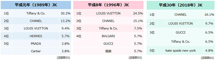 「Tiffany & Co.」「CHANEL」「LOUIS VUTTON」など、百貨店などで購入できるハイブランドが各世代でランクイン。