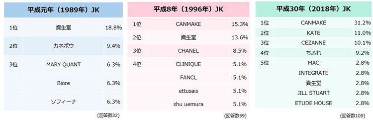 平成元年は人気アイドルのCMが話題になったことが影響してか、「資生堂」「カネボウ」が上位。平成8年ではプチプラコスメ「CANMAKE」に加え、「CHANEL」などの百貨店コスメ、いわゆる”デパコス”もランクイン。平成30年はプチプラコスメが上位を独占。