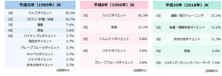 平成元年、平成8年は比較的1つのものを食べ続けるダイエットが流行。一方、平成30年は運動系ダイエットや糖質制限ダイエットなど、健康を意識した方法が多数。