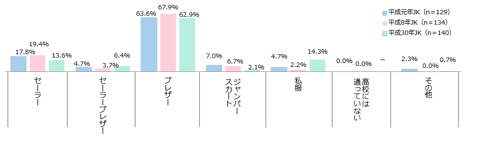 どの世代も「ブレザー」が1位で、平成元年、8年は「セーラー」が2位。平成30年は「セーラー」よりも「私服」が多い所が特徴的。