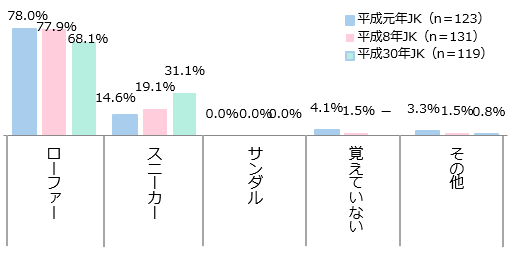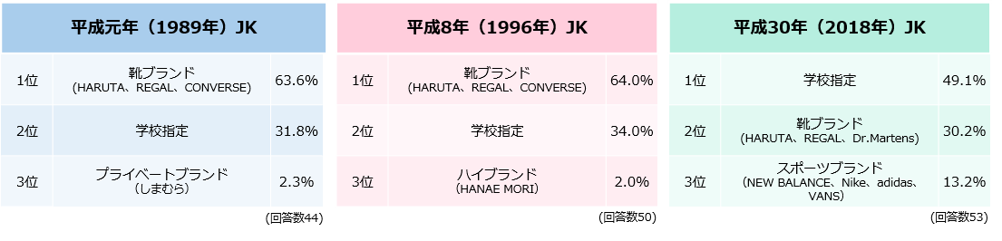| 靴編 | 各世代「靴ブランド」、「学校指定」が人気の中、平成元年は「プライベートブランド」、平成8年は「ハイブランド」、