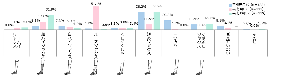 平成8年は「ルーズソックス」の人気が圧倒的。平成元年と平成30年は長めなスカートに応じて「短めソックス」を選ぶ傾向。