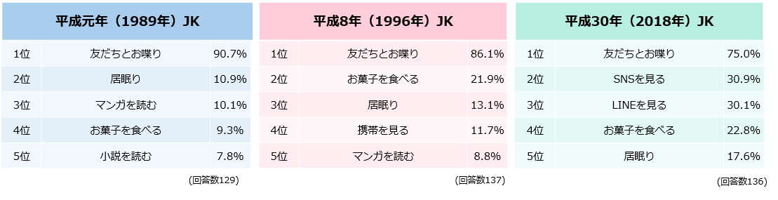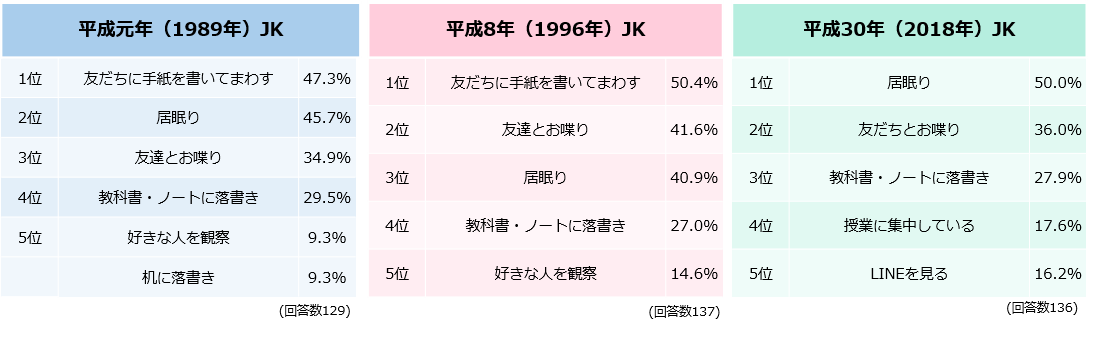 平成元年、平成8年は「友だちに手紙を回す」ことが主流だった一方で、平成30年では同項目はランク外。「LINEを見る」が台頭。