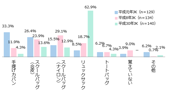 平成元年は「手提げカバン」、平成8年はナイロンの”スクバ”が人気。平成30年は私服でも流行中の「リュック」が圧倒的1位。