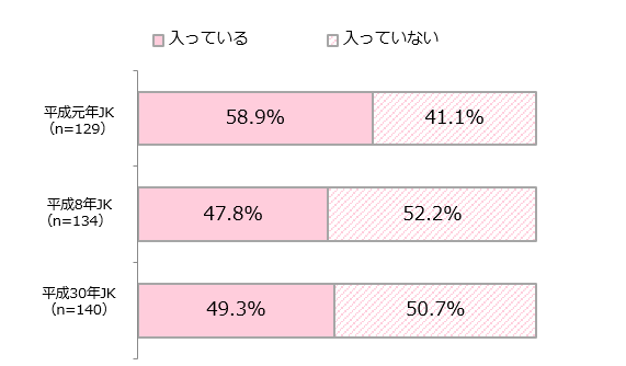 平成元年は約6割以上が部活に「入っている」のに対し、平成8年、平成30年は10ポイント近く「入っている」人が減少。