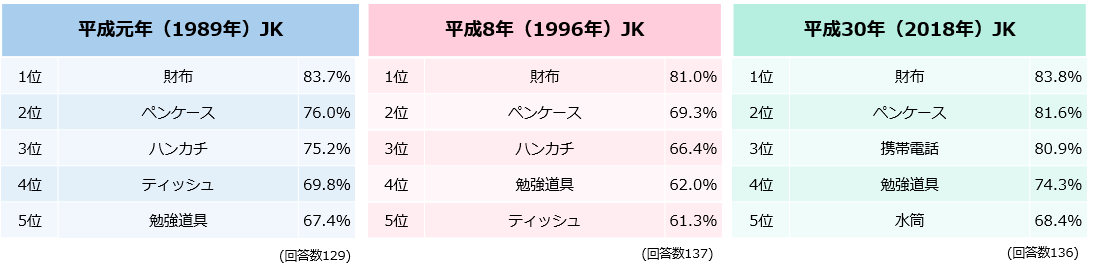 平成元年、平成8年の項目はほぼ同じ項目が並ぶ一方で、平成30年は「携帯電話」「水筒」のランクインが特徴的。