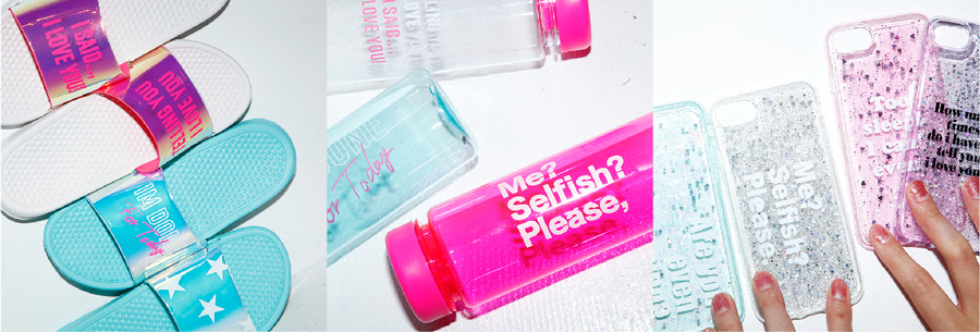 サンダルやドリンクボトルなどを、オーロラやラメ、クリア素材で夏仕様にデザイン
