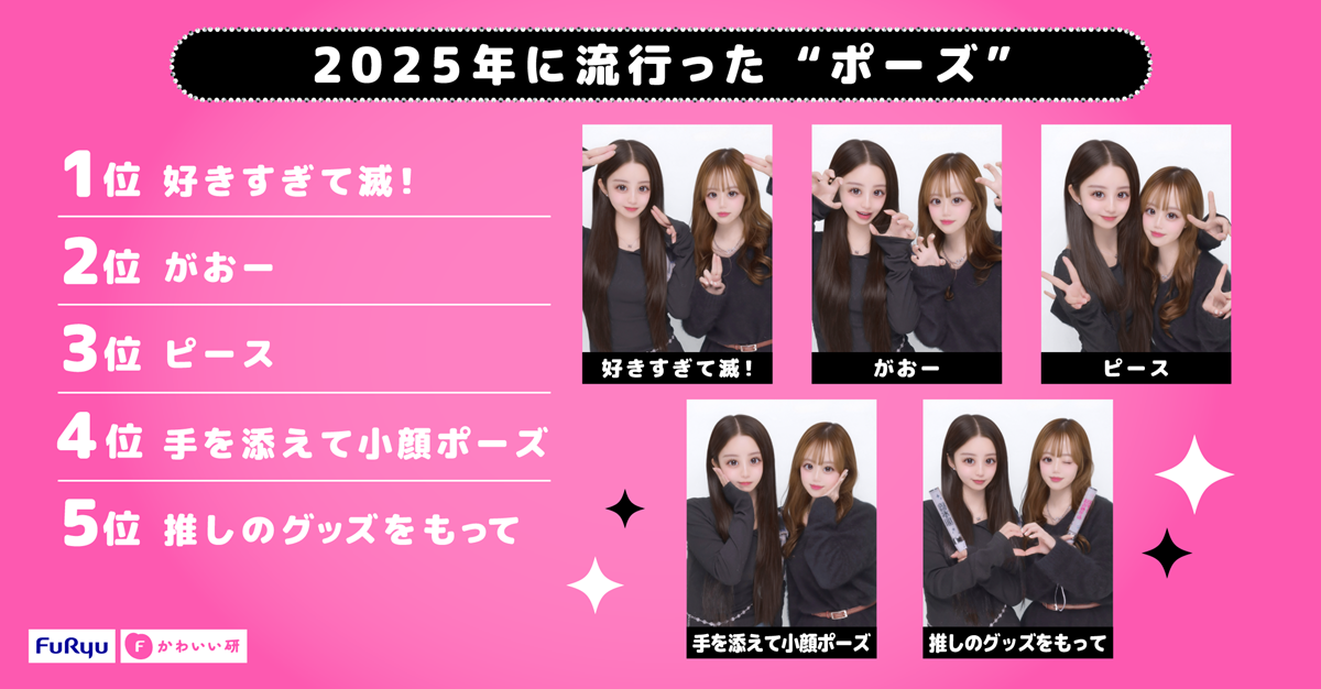 1位に選ばれたのは日本の男性5人グループ“M!LK”が結成10周年となる昨年の締めくくりにリリースした「好きすぎて滅!」の決めポーズ。「好きすぎて自分が滅んでしまいそう」という爆発的な愛をキャッチーに歌った曲で、推し活が日常の一部となったZ世代の心理とマッチしました。2025年のフリューかわいいトレンド大賞流行語部門でも“○○すぎて死ぬ”という強調スラングが2位に入っており、「好きすぎて滅!」はその最新版と言えそうです。TikTokでは振り付けを真似する人が続出してバズり、“M!LK”が初めて昨年の紅白歌合戦に出場するなど、大きな話題となった影響がプリにも届いた結果となりました。また5位には「推しのグッズをもって」がランクインしており、プリの楽しみ方でも推し活が主軸になっていることが伺えます。その他2位〜4位には、平成時代からの定番ポーズ「がおー」「ピース」「小顔ポーズ」がランクインしました。