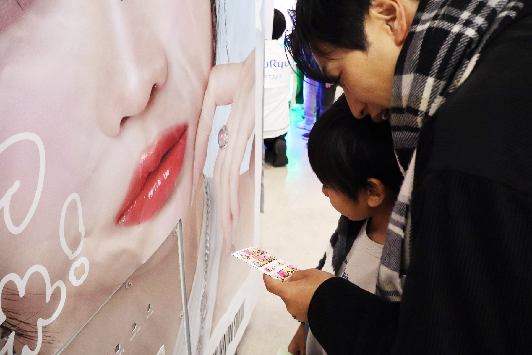 「プリ機のシール紙を補充して撮影できるようにしよう!」沢山ある機種の中から当てはまる2機種のシール紙を探し出し、店員役のフリュー社員に補充を依頼するミッションを通じて、プリを撮るためにお店の人が様々な準備をしてくれていることを知ってもらいました。