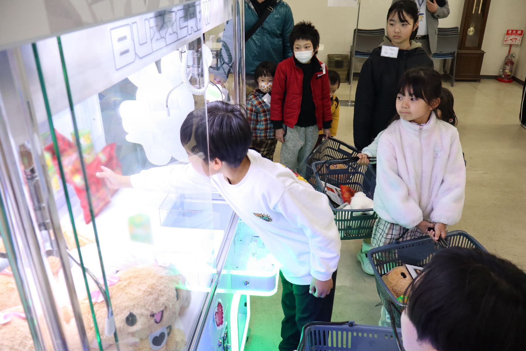 「商品を実際に遊べるように準備しよう!」検査を経て安全性を確認した後、クレーンゲームに景品のお菓子やぬいぐるみを入れて、楽しく遊んでもらえるように配置。普段お店でクレーンゲームを遊ぶ時に目にする状態に至るまでを実際に体験することで、お店に商品が納品された後の流れをお店の立場から体感してもらいました。