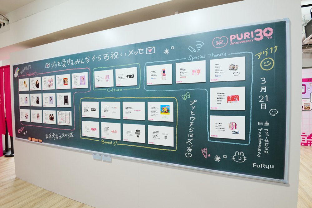 プリを愛する著名人、企業、ブランド総勢28名からの寄稿メッセージを卒業の日のクラス黒板のように展示。