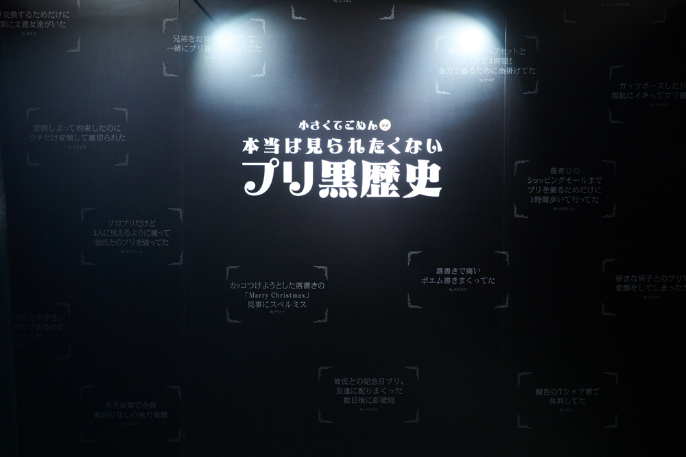 誰もが隠し持っているであろう、黒歴史プリ(しかも公募で集めたリアル黒歴史プリ)を会場の奥の小部屋にこっそり展示。恥ずかしすぎる黒歴史プリはとても小さく展示 しているため、虫眼鏡でご覧ください。