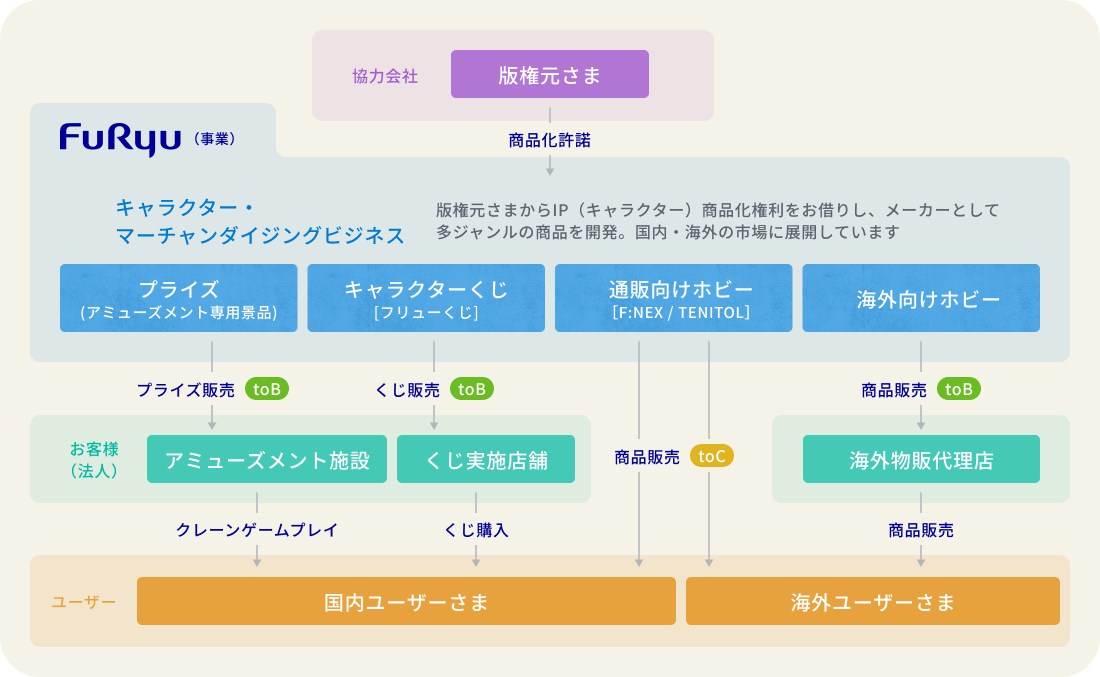 プライズ(アミューズメント専用景品)や、はずれなしのキャラクターくじ、ECサイト『Furyu Hobby Mall』などで販売する通販向けホビー、世界中に向けてお届けしている海外向けホビーなどのキャラクターグッズ関連事業を展開しています。キャラクターの世界観や、ファンであるお客さまがキャラクターに対して抱いているイメージを大切にし、その魅力をしっかりとお伝えすべく商品づくりを行っています。