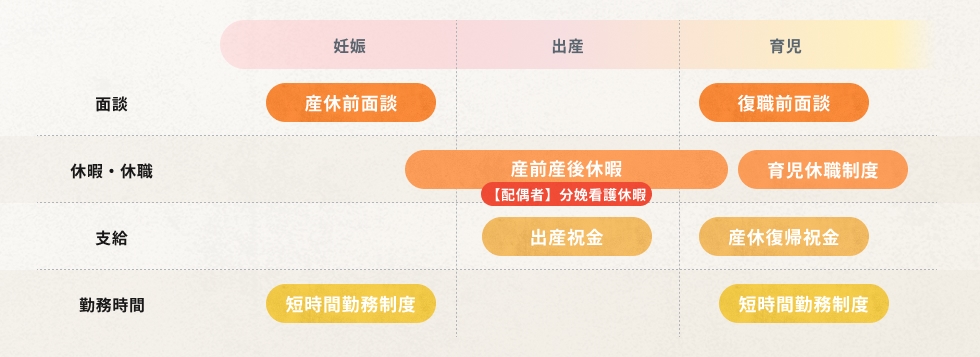 法定より2週間早く産休に入ることが可能で、この期間中には見舞金が支給されます。また、産育休から復職した際にはお祝い金が支給されます。