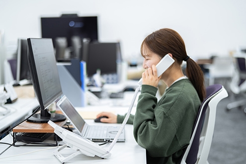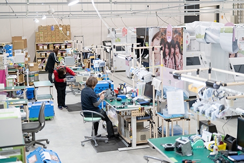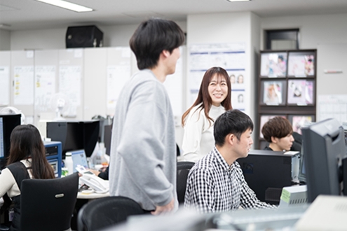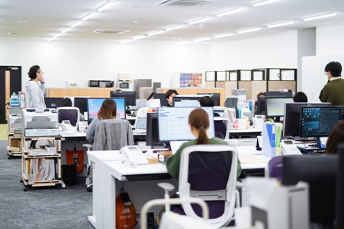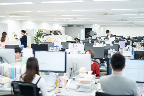 フリューで最も広い一宮事業所は、生産管理・物流の要として全国へ商品を届ける拠点です。広々とした開放感のあるオフィスで、効率的な業務を支えています。