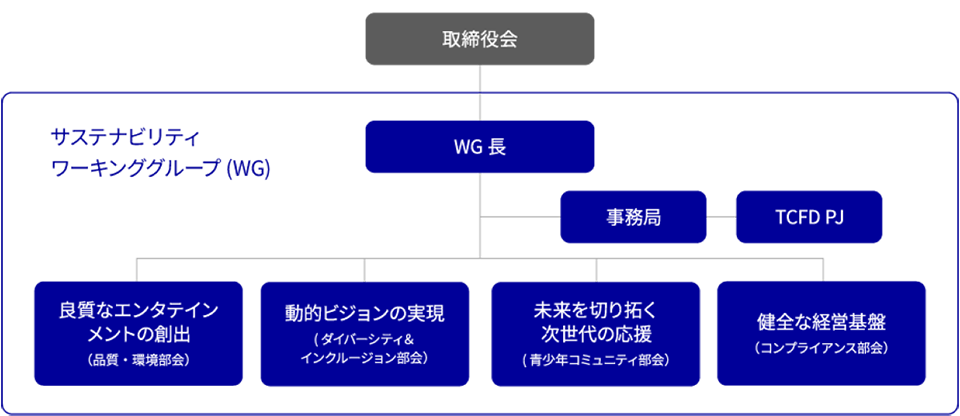 フリューでは、以下の体制を推進しています。また、ワーキンググループのみならず、フリューの社員一人ひとり、全部門がそれぞれの業務を通じて推進していくものである、という考えのもとで各取り組みを行っています。